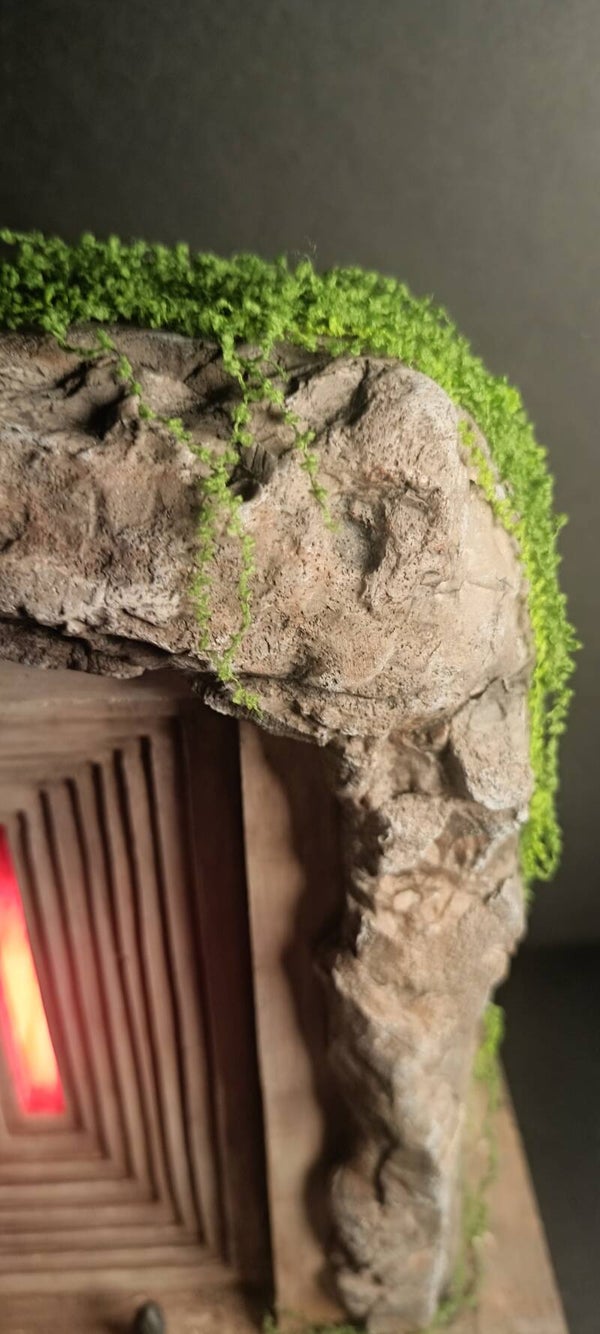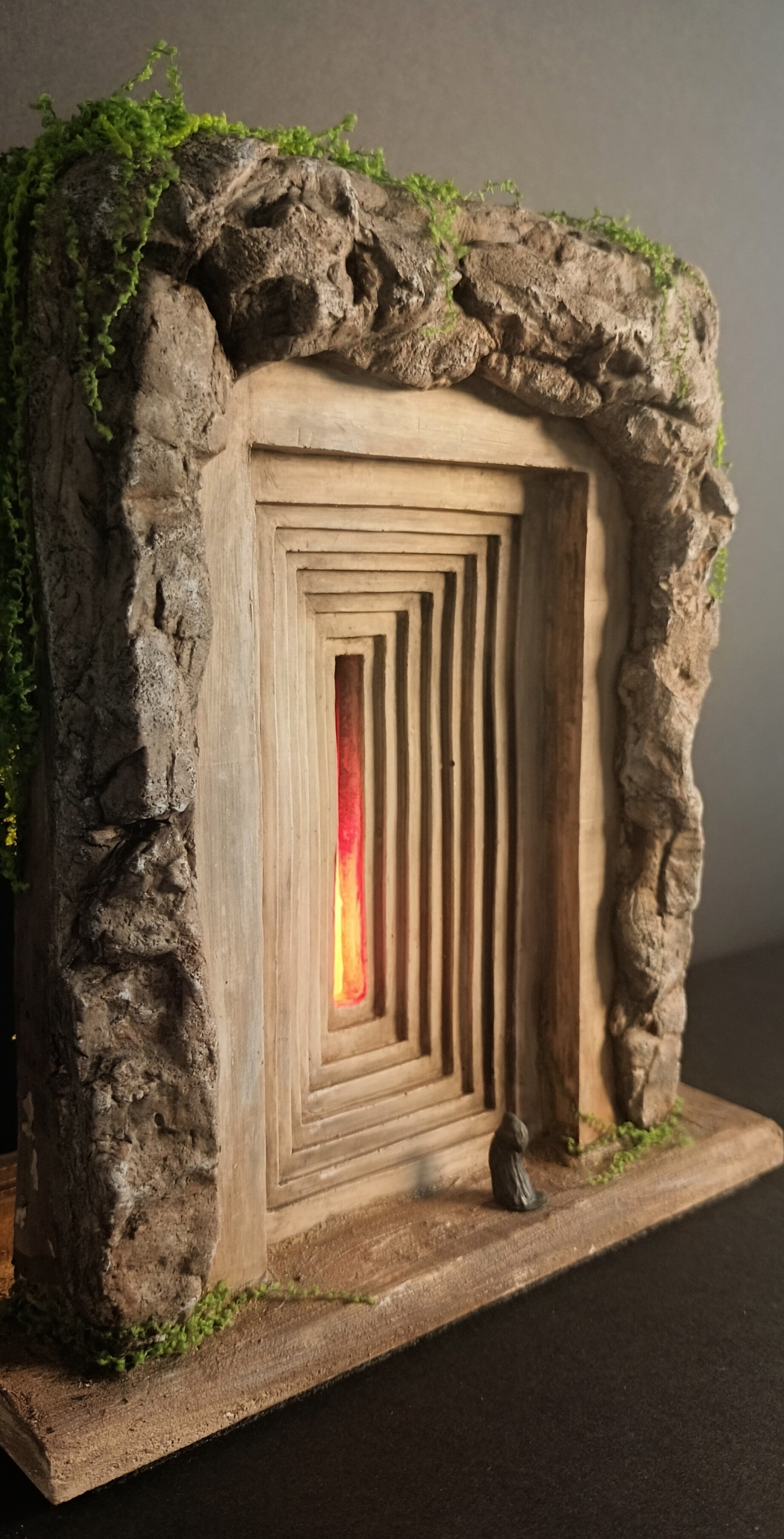 Une veilleuse représentant une porte creusée dans la roche, à l'architecture cyclopéenne, influencée par les récits de Cosmic Horror.